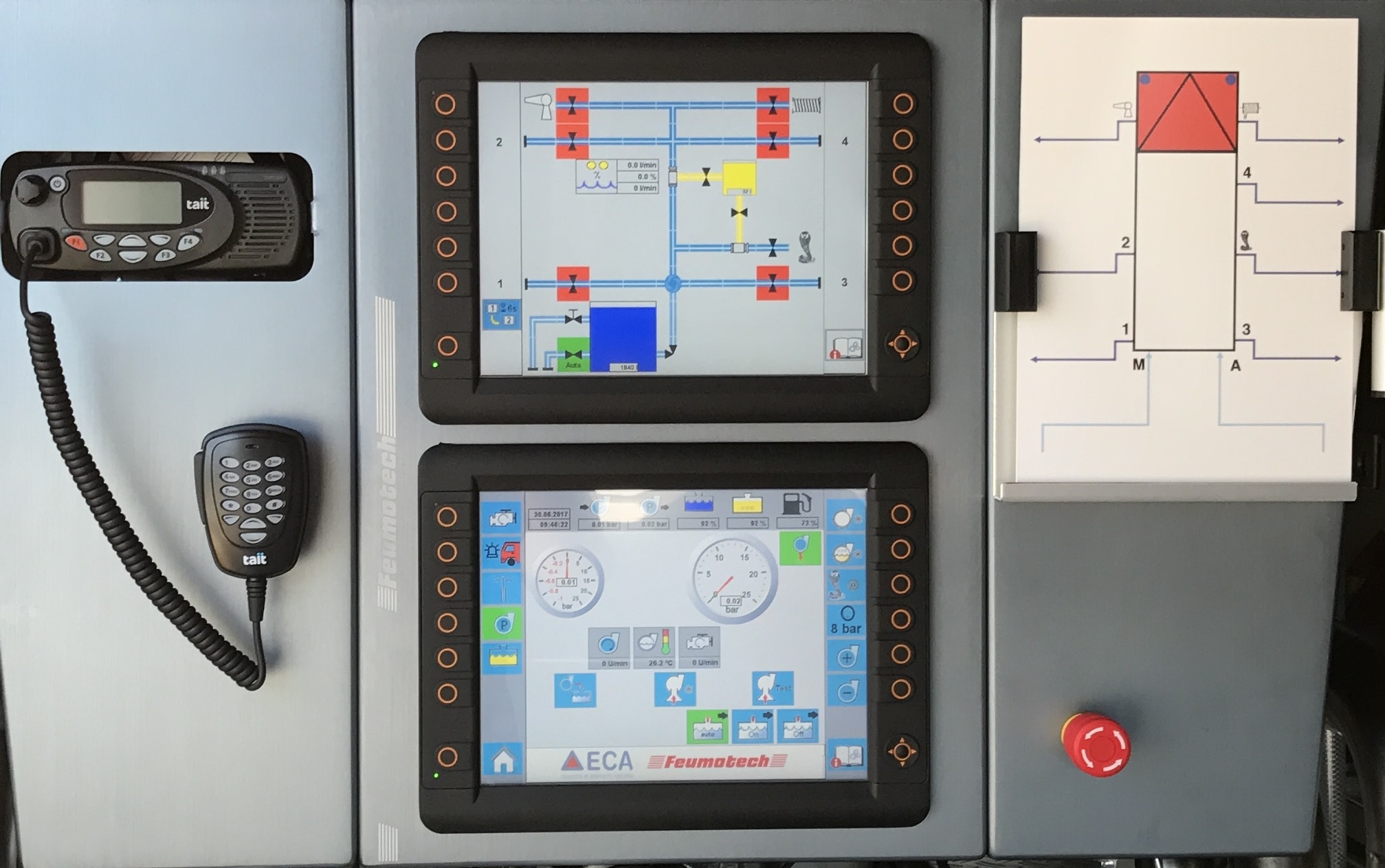 Dévidoir d'attaque rapide: 40m de tuyau avec rouleau d'orientation escamotable. Enroulement électrique avec frein de dévidoir.